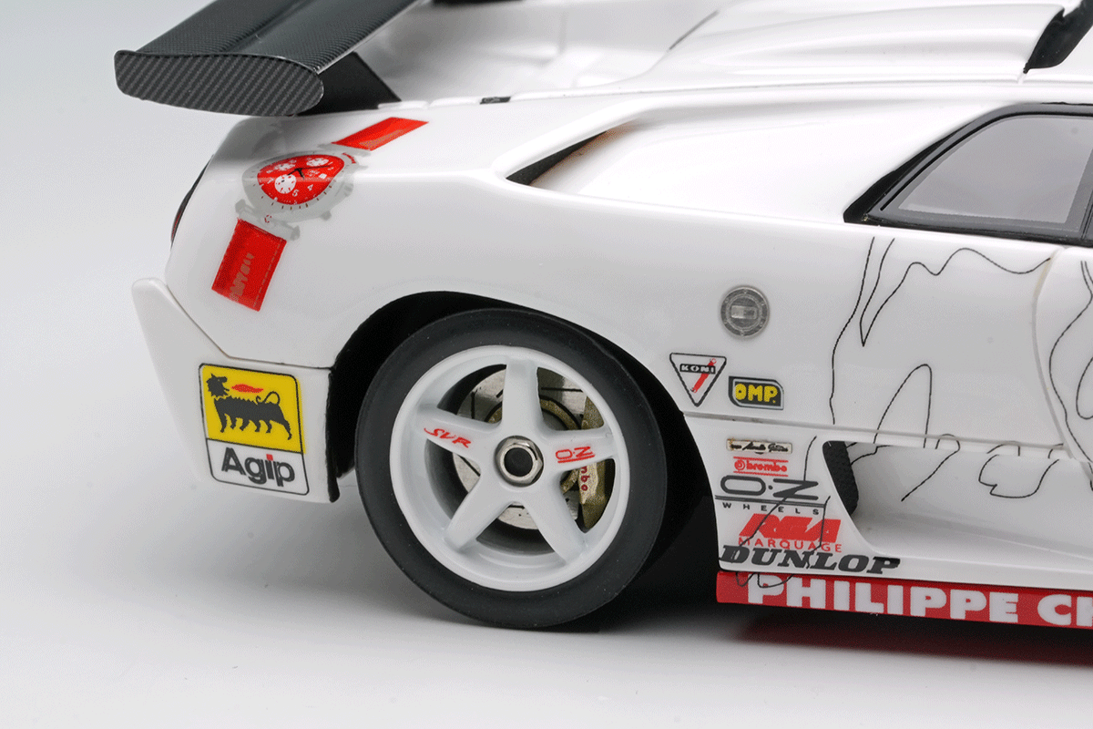 ランボルギーニ ディアブロSVをベースに軽量化などを施された「ランボルギーニ ディアブロ SVR」を忠実に再現したモデルです。今回のモデルはプロモーション時に貼られていたワンメイクレースのスポンサーロゴを追加した仕様になります。