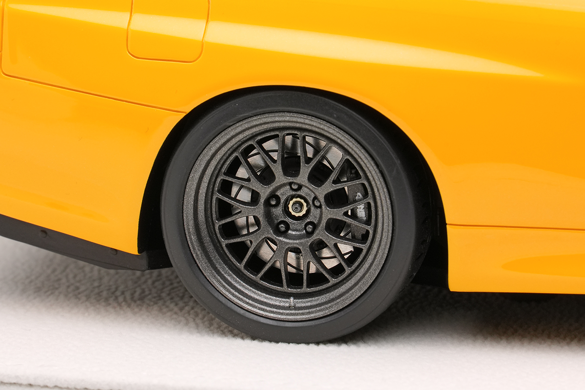 レイズ製の「VOLK RACING 21A」やAP Racingのブレーキなども再現しています。ホイールリムはガンメタリックを施しますが、シャープなスポークを再現するために強度のあるインジェクション成型パーツを使用しています。