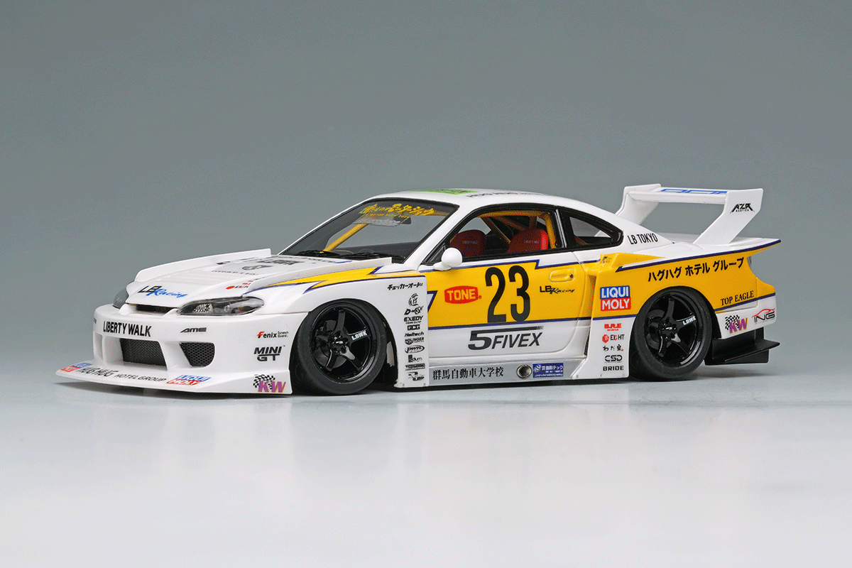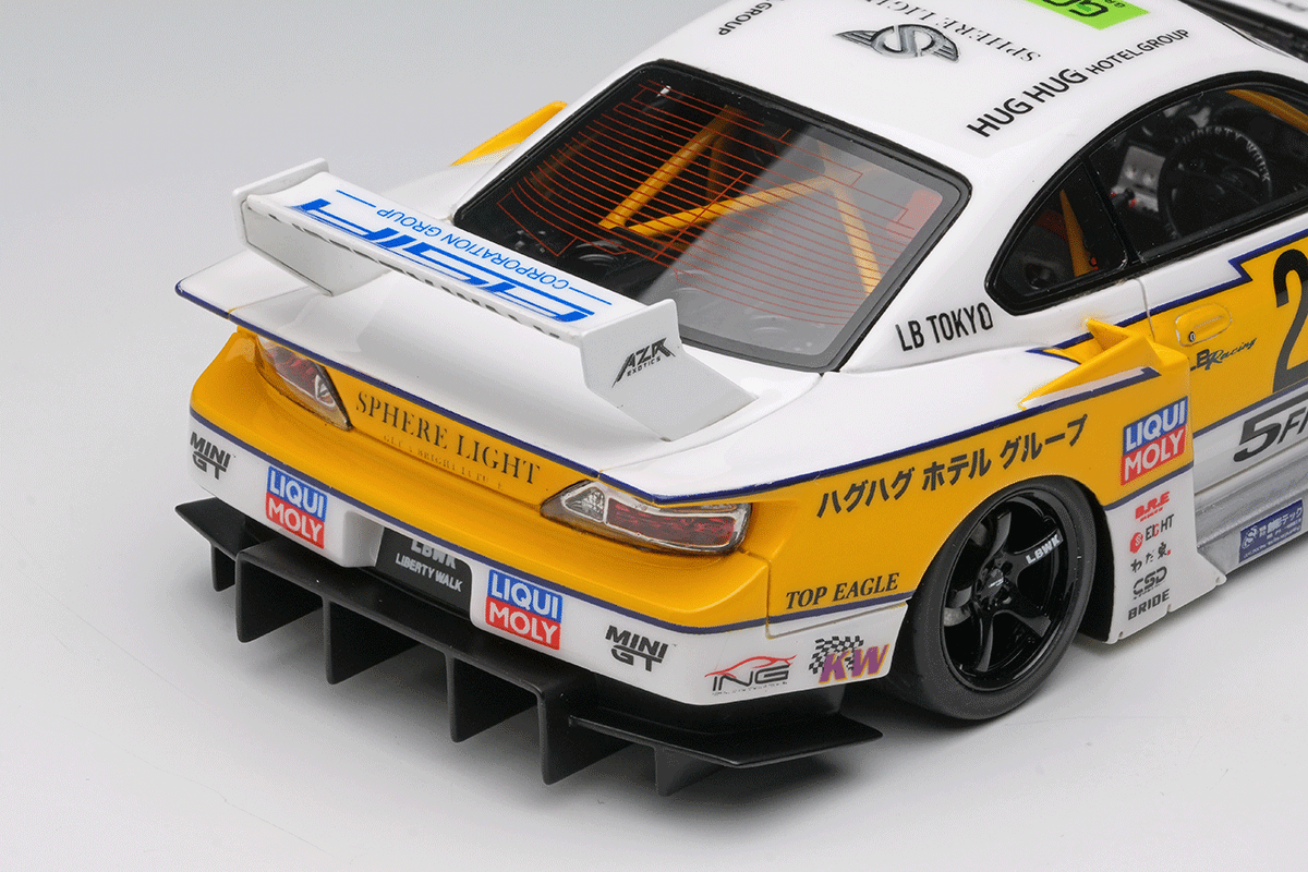 実車のLBシルエットワークス シルビア S15は2021年から現在にいたるまで数台が製作されていますが、こちらのモデルは同車のデビューイベントともなった、奥伊吹モーターパークで開催された『俺たちのモータショウ』でドリフト・デモランを披露した時の姿を再現しております。