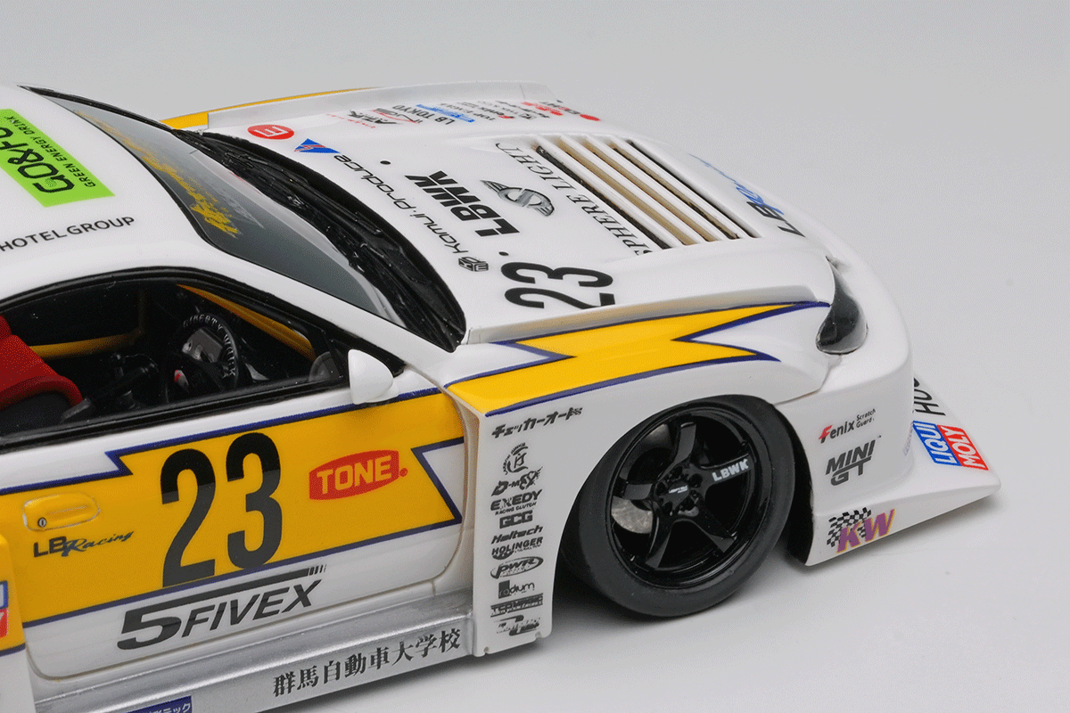 往年のシルビアシルエットフォーミュラをオマージュしたイナズマリバリーを纏った「LBシルエットワークス シルビア」を正確に再現したモデルカーとなります。