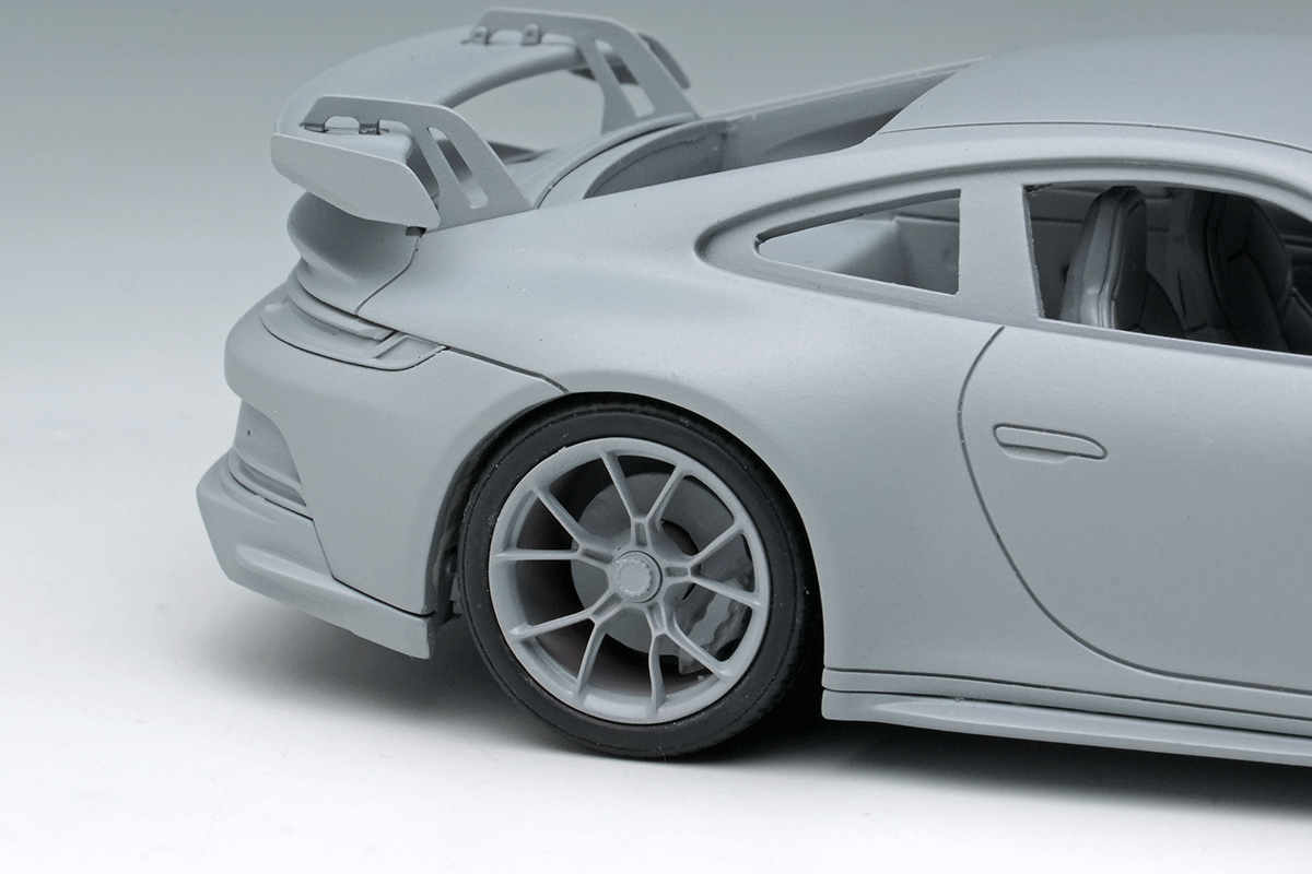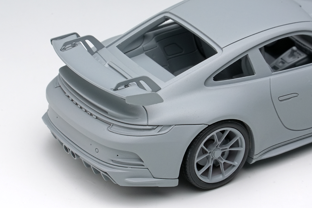 そして2021年にサーキット走行も楽しみたいというハードコアな911ファンの声に応えるべく、1999年に997型に設定されて以来ベース車と共に世代交代を続けてきたGT3グレードが発売されました。GT3グレードはもともとはFIAのGT3 カップ用のホモロゲ車として開発されたもので、ハードなサスペンションや後席を廃するなど徹底した軽量化、そして専用チューンの自然吸気ユニットが特徴となっています。弊社がモデルのモチーフとしたのは992型の前期型、通称992.1型のGT3で、510馬力を発生する自然吸気の4リッターエンジンを搭載し、ボディ各所にはレーシングカーさながらのダウンフォースを発生させるグースネックウィング他、専用のエアロディバイスが装着されています。