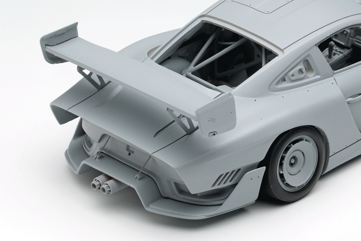 935/19は991シリーズの「GT2 Club sport」をベースにしていますが、ドアやルーフにその面影を残すものの、それ以外の部分はまったく共通性がなく、ほぼ完全新規での製作となりました。車体は前後のアンダーエアロ/ディフューザー類、延長されたテールエンドの下に覗くリアフェイシアは別パーツとして、奥まで入り組んだ部位の複雑な造形を正確に再現。