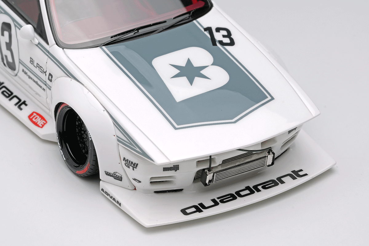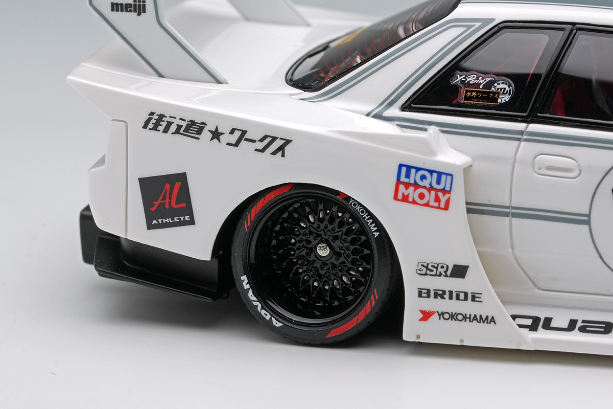 ボディはフロントのワークスフェンダー、リアのフルシルエットスタイル(フェンダー0を付け足すのではなく、テールライト間隔やバンパーも拡幅するスタイル)フェンダー、フロントのデッパやロングノーズは一体成型としていますが、シルエットフェンダーのダクト部分の“抜け感”には拘っており、レジン鋳造の限界に挑戦しての表現となります。