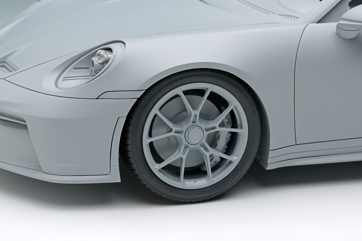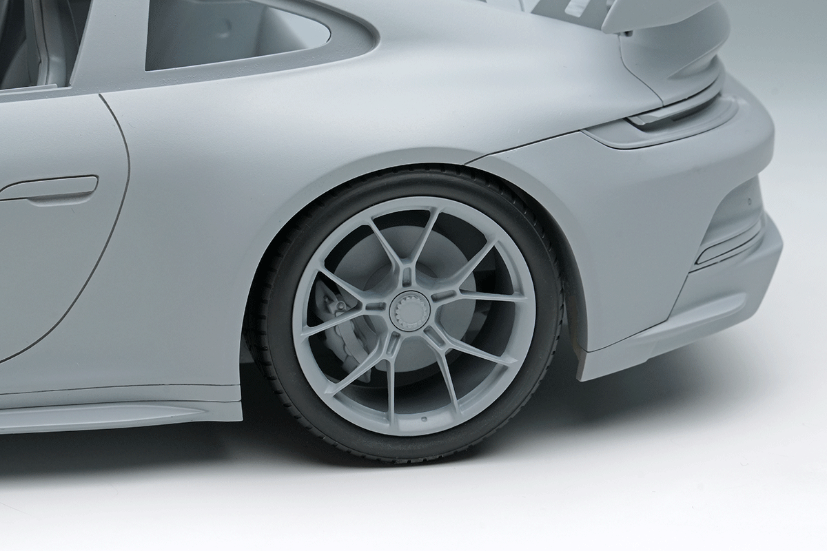 そして2021年にサーキット走行も楽しみたいというハードコアな911ファンの声に応えるべく、1999年に997型に設定されて以来ベース車と共に世代交代を続けてきたGT3グレードが発売されました。GT3グレードはもともとはFIAのGT3 カップ用のホモロゲ車として開発されたもので、ハードなサスペンションや後席を廃するなど徹底した軽量化、そして専用チューンの自然吸気ユニットが特徴となっています。弊社がモデルのモチーフとしたのは992型の前期型、通称992.1型のGT3で、510馬力を発生する自然吸気の4リッターエンジンを搭載し、ボディ各所にはレーシングカーさながらのダウンフォースを発生させるグースネックウィング他、専用のエアロディバイスが装着されています。