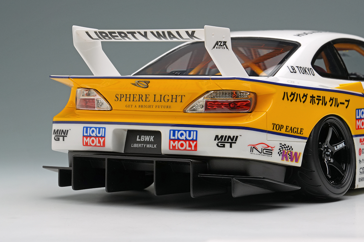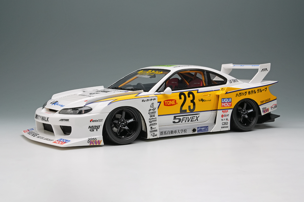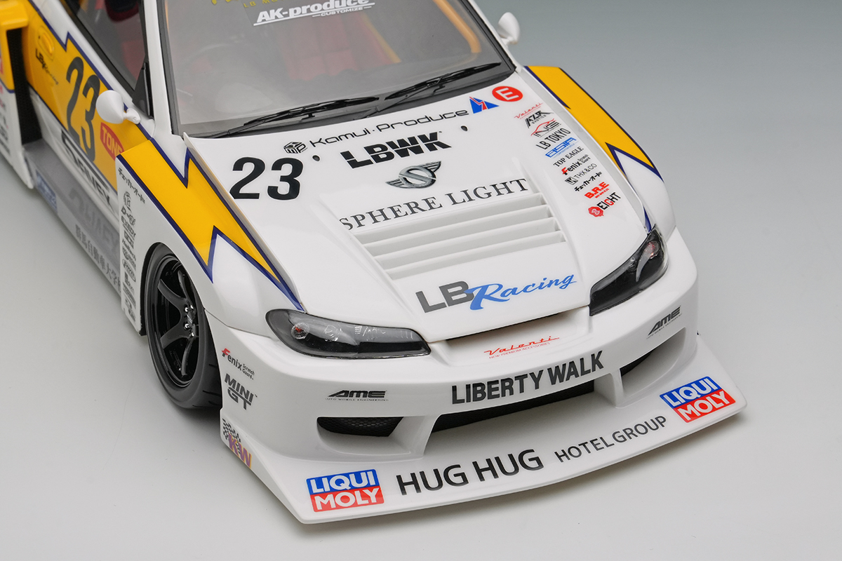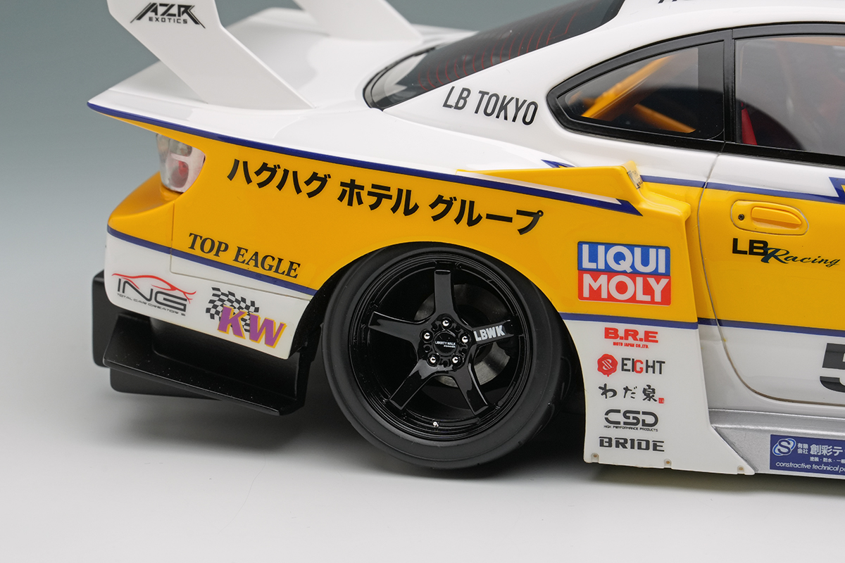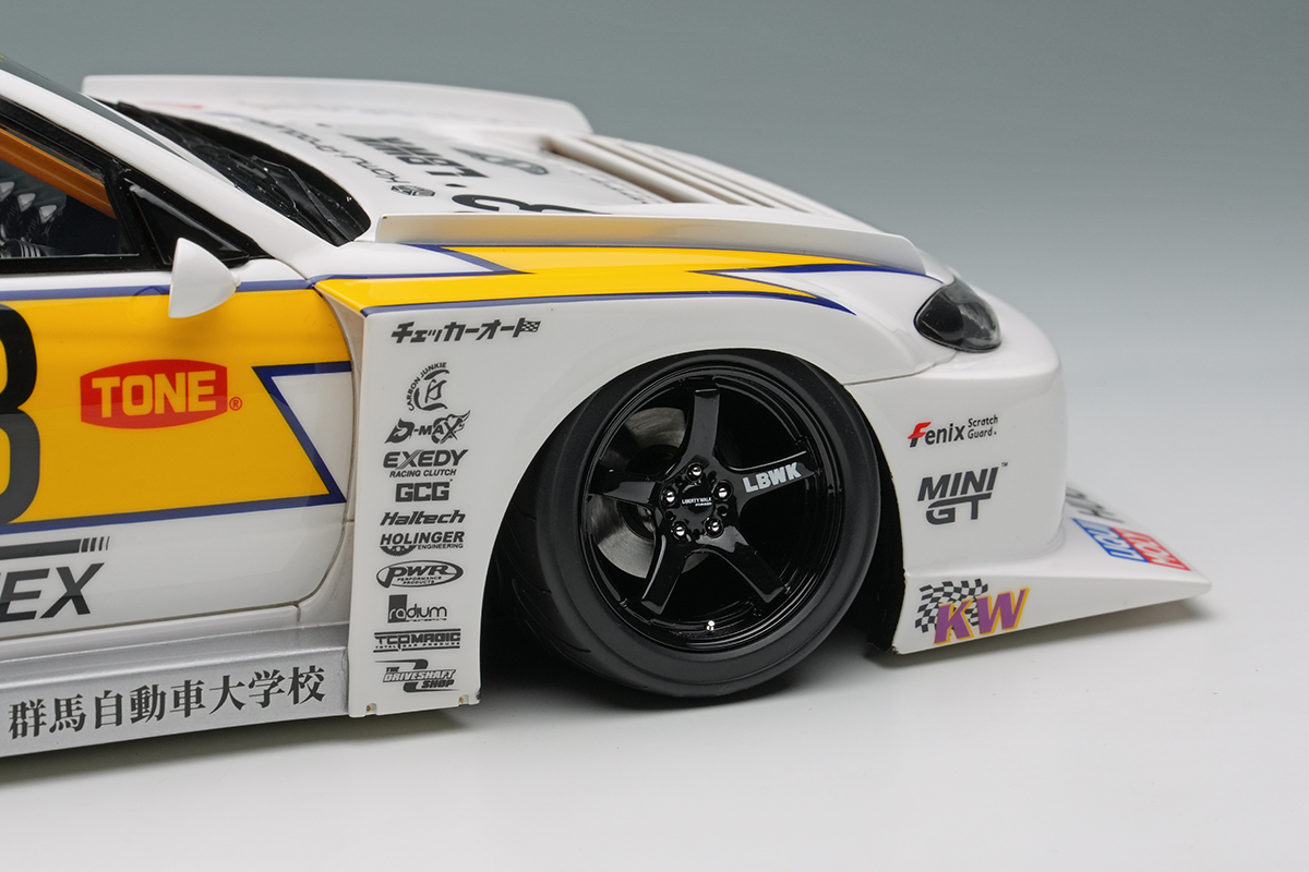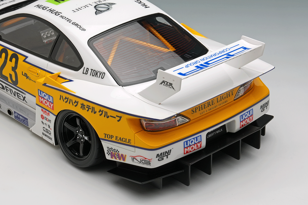 往年のシルビアシルエットフォーミュラをオマージュしたイナズマリバリーを纏った「LBシルエットワークス シルビア」を正確に再現したモデルカーとなります。
