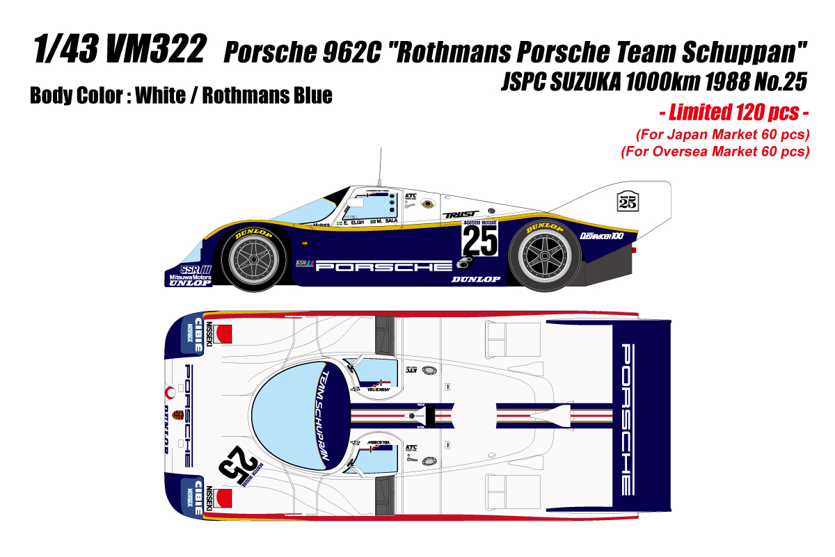 1988年の全日本スポーツプロトタイプカー耐久選手権(JSPC)の中の一戦、「SUZUKA 1000kmレース」に出場した「ポルシェ 962C "ロスマンズポルシェ チームシュパン“」を再現したモデルになります。
