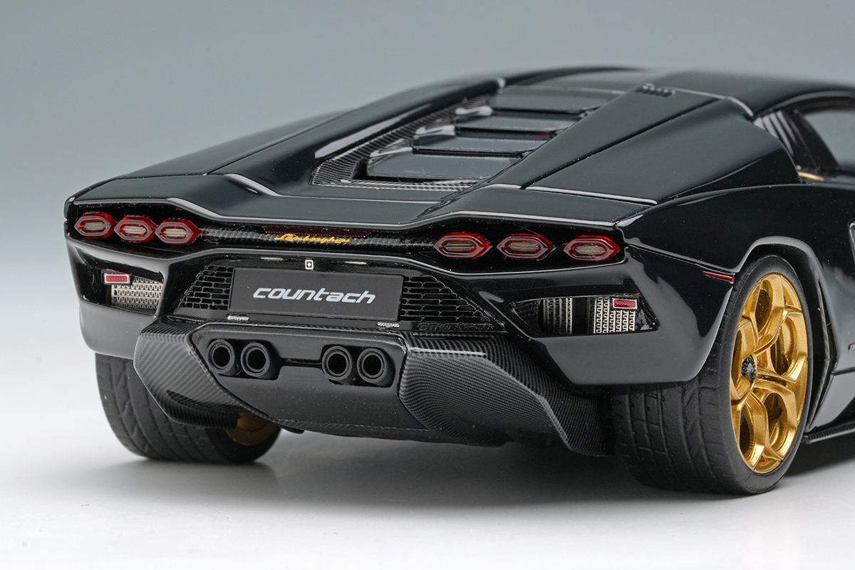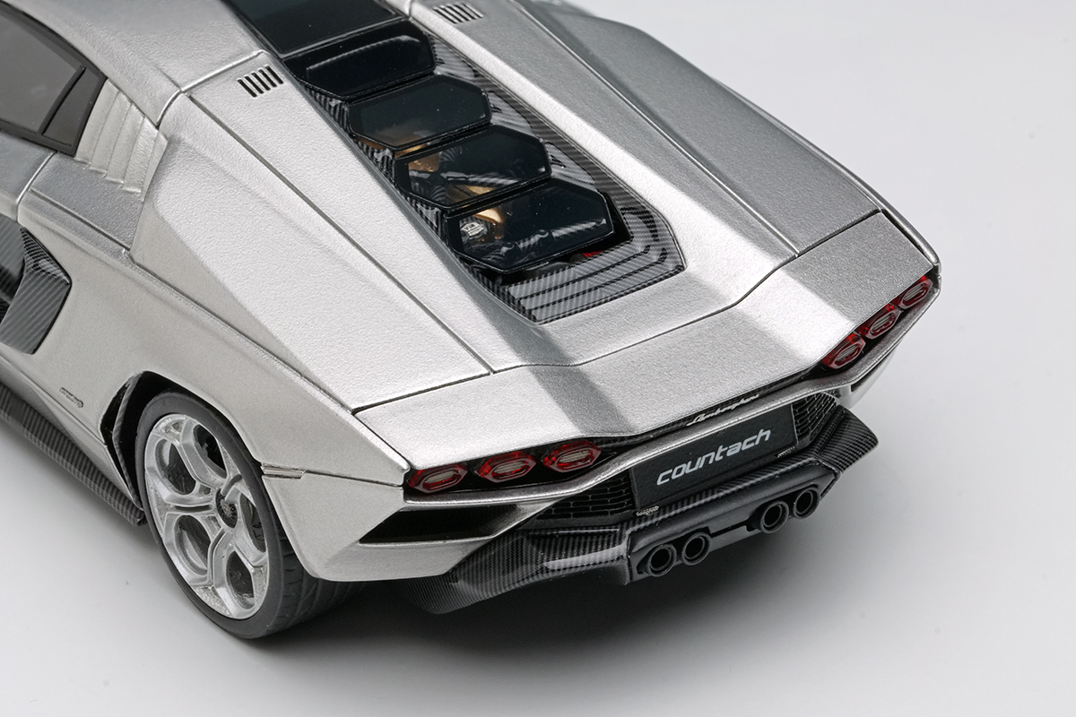 同じく初代カウンタックのそれを彷彿とさせる外形のテールライトハウジングの掘り込みの深さの再現も注目していただきたいポイントとなります。灯火類も実車のパーツ構成を分析して、それに倣ったパーツ構成を採ることで実車さながらの表情を演出しました。