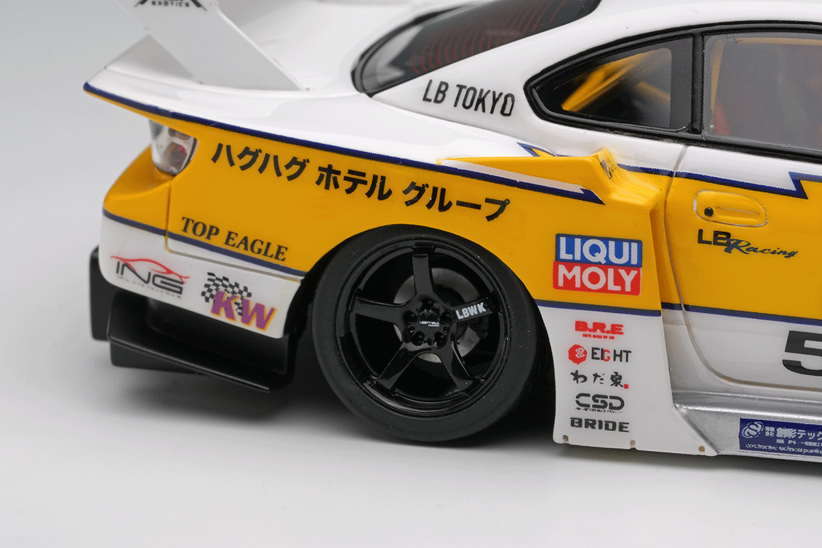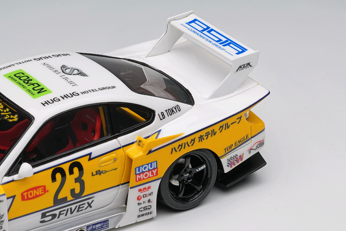 実車のLBシルエットワークス シルビア S15は2021年から現在にいたるまで数台が製作されていますが、こちらのモデルは同車のデビューイベントともなった、奥伊吹モーターパークで開催された『俺たちのモータショウ』でドリフト・デモランを披露した時の姿を再現しております。