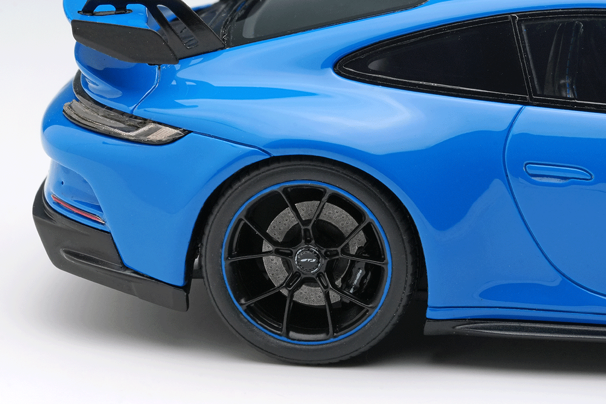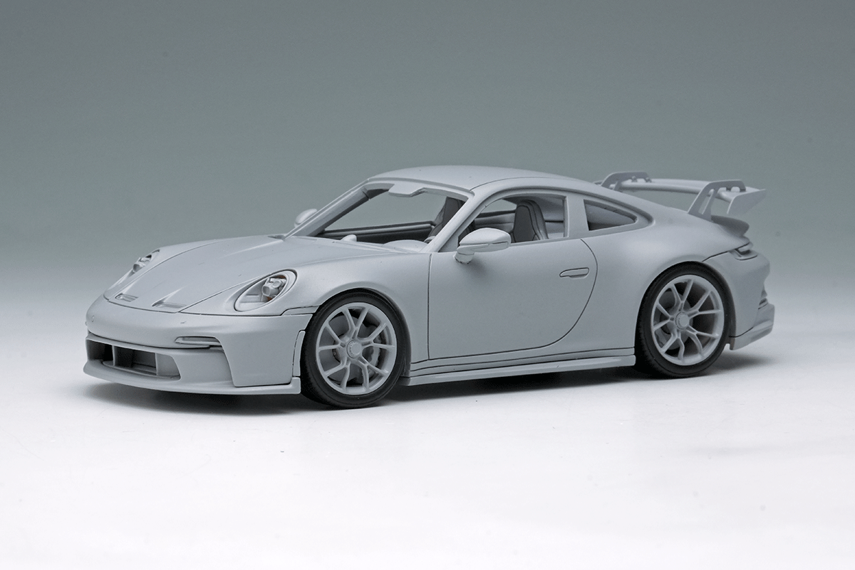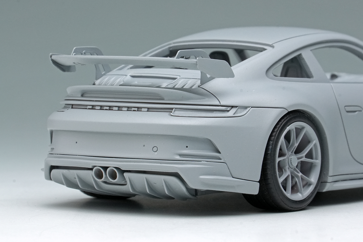 そして2021年にサーキット走行も楽しみたいというハードコアな911ファンの声に応えるべく、1999年に997型に設定されて以来ベース車と共に世代交代を続けてきたGT3グレードが発売されました。GT3グレードはもともとはFIAのGT3 カップ用のホモロゲ車として開発されたもので、ハードなサスペンションや後席を廃するなど徹底した軽量化、そして専用チューンの自然吸気ユニットが特徴となっています。弊社がモデルのモチーフとしたのは992型の前期型、通称992.1型のGT3で、510馬力を発生する自然吸気の4リッターエンジンを搭載し、ボディ各所にはレーシングカーさながらのダウンフォースを発生させるグースネックウィング他、専用のエアロディバイスが装着されています。