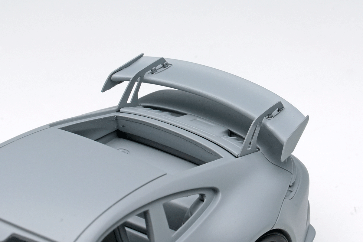 GT3を特徴づけるグースネック型ウィングは、支柱にエッチングパーツ、主翼にホワイトメタルを使用することで、シャープな造形と高い耐久性を両立しています。