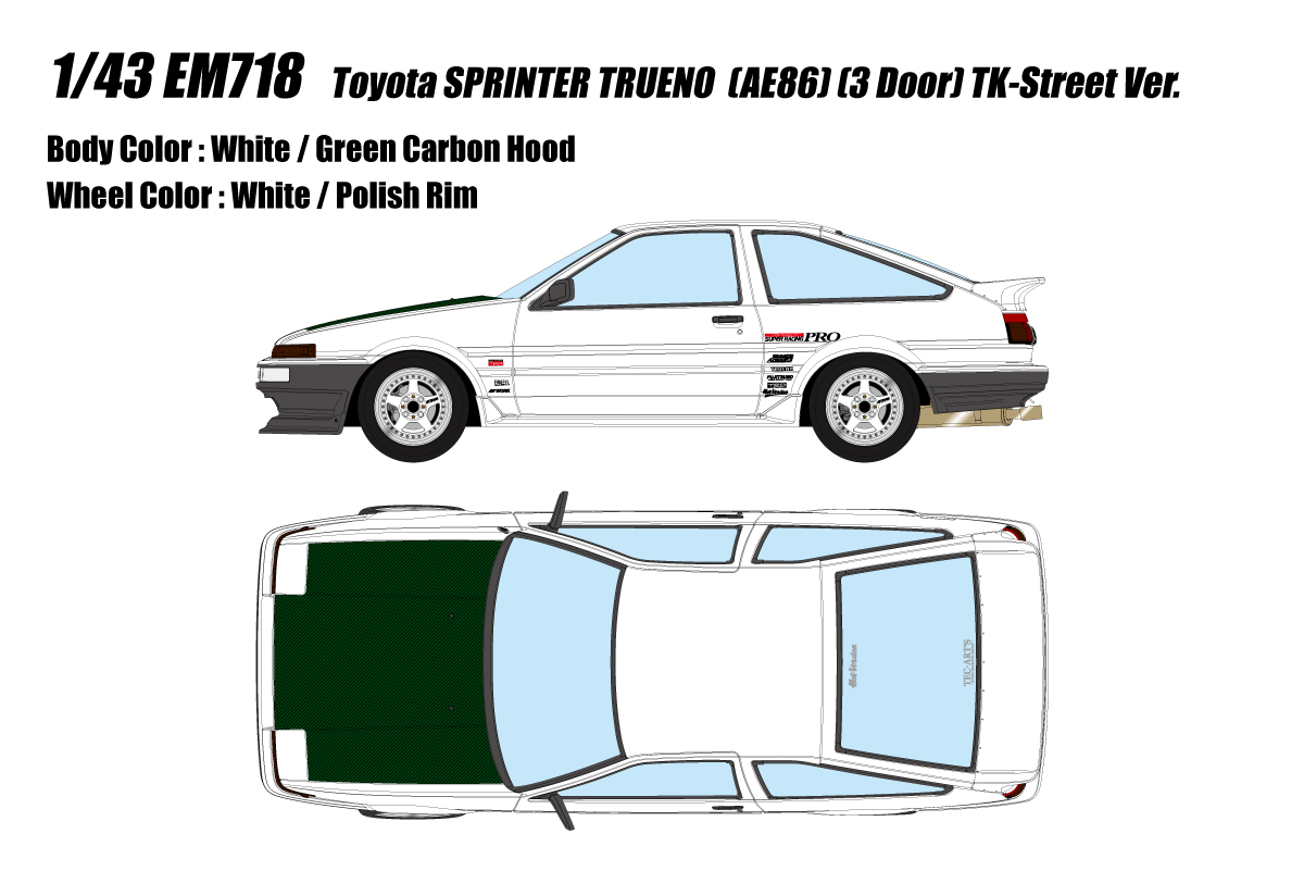 元レーシングドライバーでもあり、現在も多数のレースやメディアで活躍する土屋圭市氏のプライベートカー「トヨタ スプリンタートレノ(AE86) (3 Door) TK Street Ver.」を忠実に再現したモデルになります。