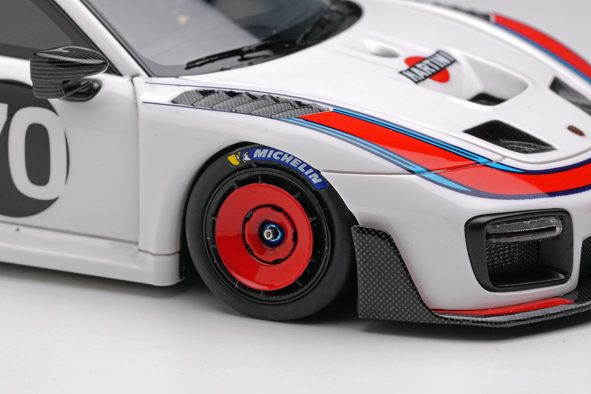 ボディカラーは実車の多くがまとう、マルティニ・レーシング調のストライプをデカールで表現。その上に丹念なクリアコーティング塗装を施し、1台1台職人が手作業で鏡面状態まで仕上げています。