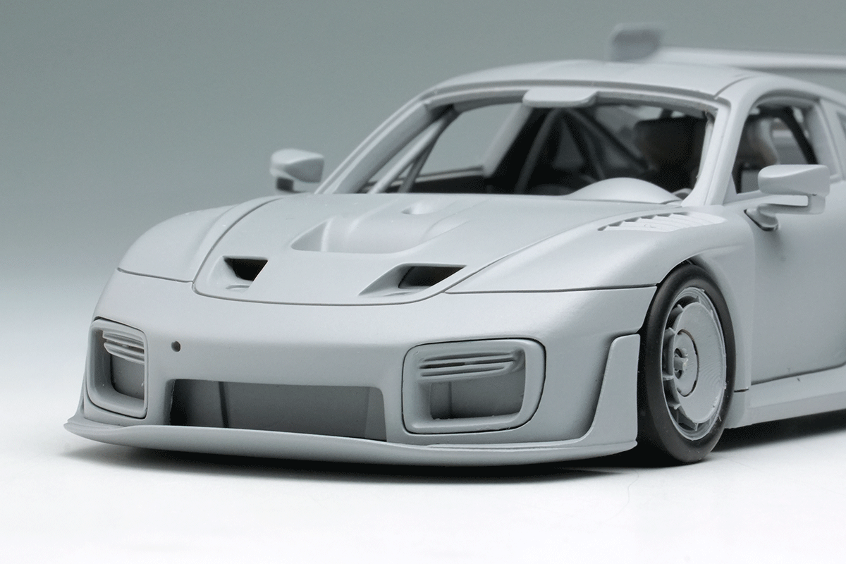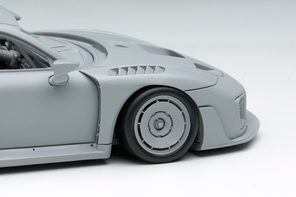 またシルエットフェンダー、フロントフードのダクトの抜けの部分は奥行感や縁(へり)の薄さにも拘っています。放熱性と空気抵抗の低減を狙ったホイールのエアロディスク/ベーン(ターボファン)も立体感豊かに再現。こちらは真鍮切削原型をホワイトメタル鋳造へと置き換えての再現となります。