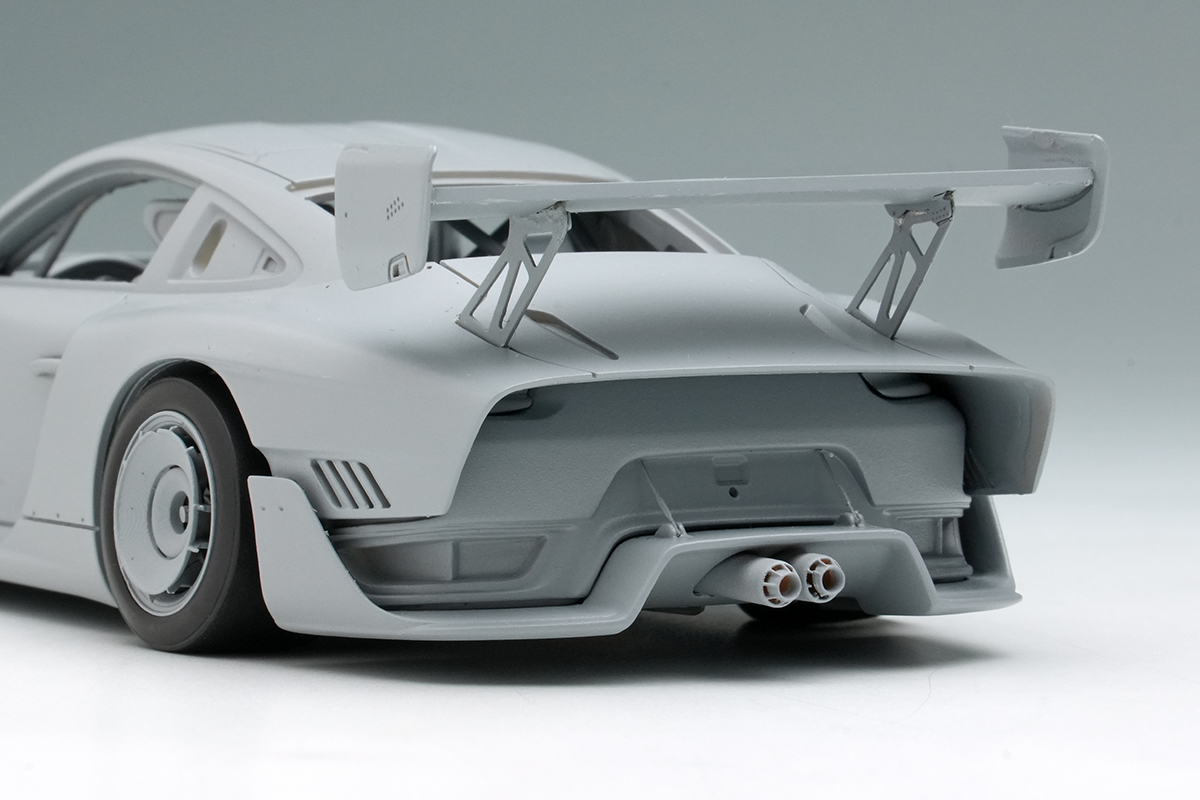 935/19は991シリーズの「GT2 Club sport」をベースにしていますが、ドアやルーフにその面影を残すものの、それ以外の部分はまったく共通性がなく、ほぼ完全新規での製作となりました。車体は前後のアンダーエアロ/ディフューザー類、延長されたテールエンドの下に覗くリアフェイシアは別パーツとして、奥まで入り組んだ部位の複雑な造形を正確に再現。