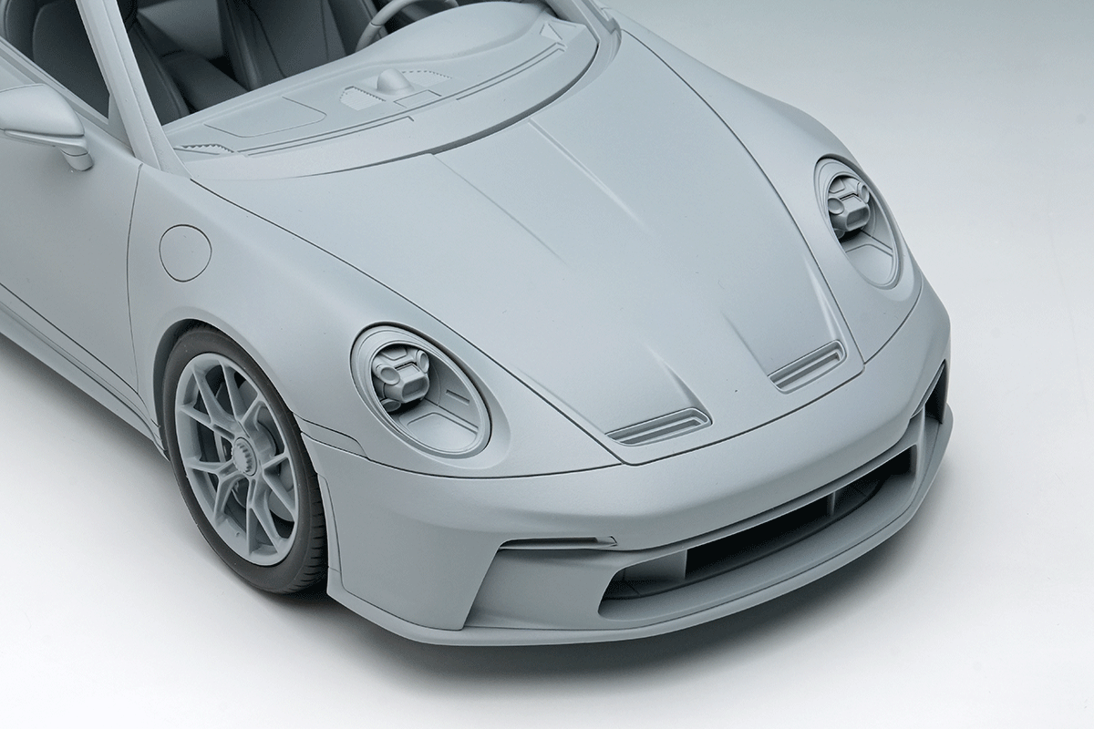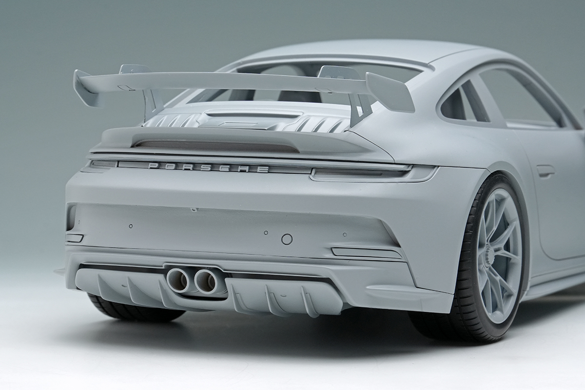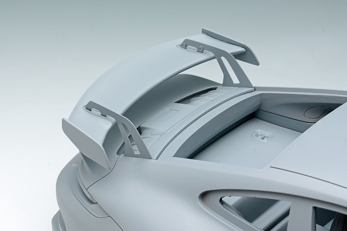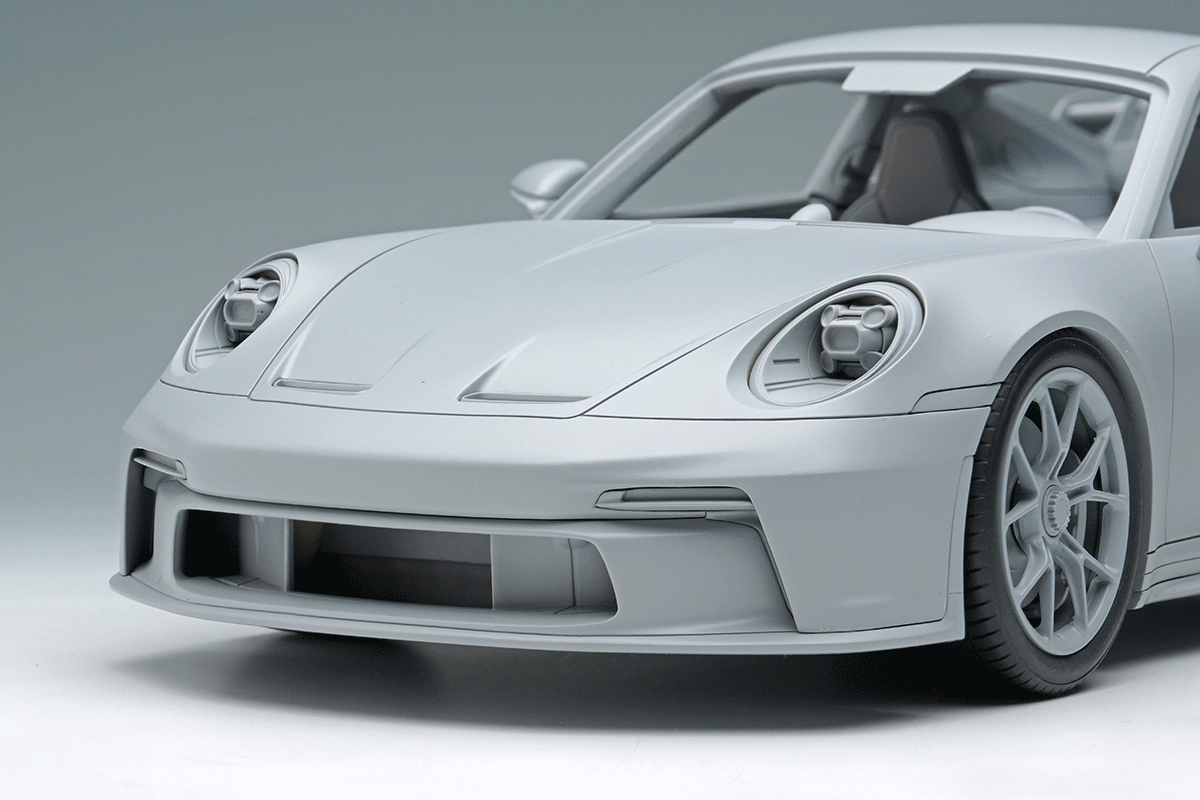そして2021年にサーキット走行も楽しみたいというハードコアな911ファンの声に応えるべく、1999年に997型に設定されて以来ベース車と共に世代交代を続けてきたGT3グレードが発売されました。GT3グレードはもともとはFIAのGT3 カップ用のホモロゲ車として開発されたもので、ハードなサスペンションや後席を廃するなど徹底した軽量化、そして専用チューンの自然吸気ユニットが特徴となっています。弊社がモデルのモチーフとしたのは992型の前期型、通称992.1型のGT3で、510馬力を発生する自然吸気の4リッターエンジンを搭載し、ボディ各所にはレーシングカーさながらのダウンフォースを発生させるグースネックウィング他、専用のエアロディバイスが装着されています。