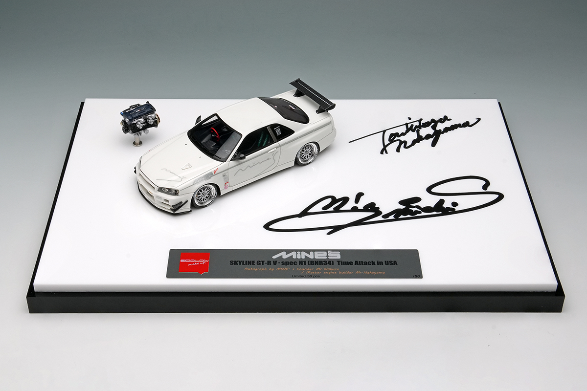 2ピースのBBSホイールや赤いスパルコ製ステアリングなど、豊富な資料を基に細部まで忠実に再現しており、さらに、精密に再現された1/43スケールの「MINE's RB26DETTエンジン」モデルが付属します。